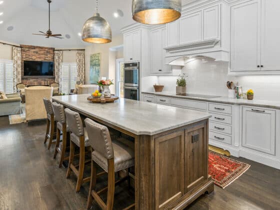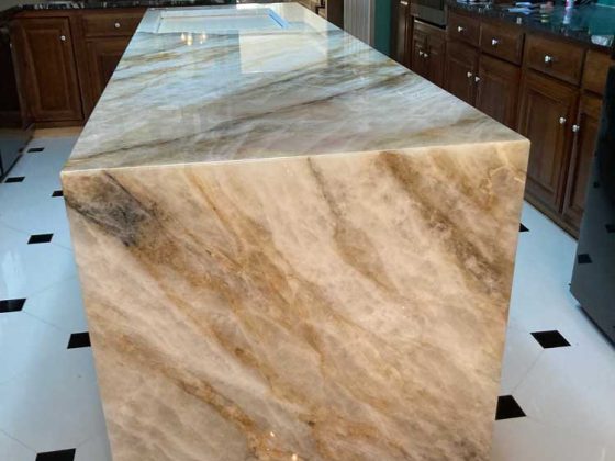 Waterfall countertops are among the most requested premium upgrades for modern kitchens. The style draws attention immediately because the stone surface flows vertically down the